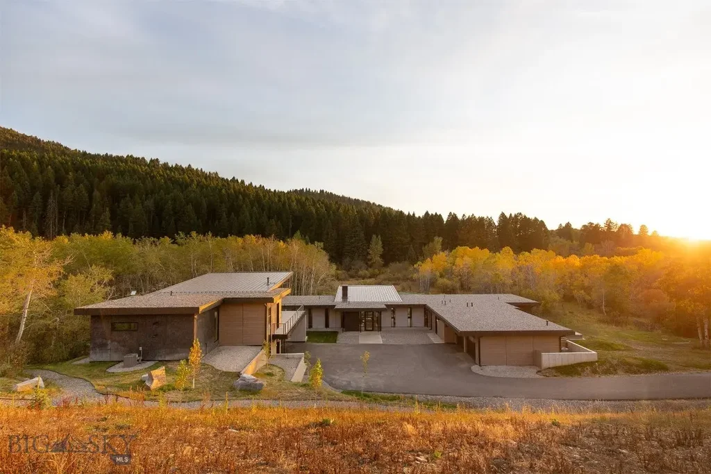 Welcome to a breathtaking modern luxury estate set on 14 acres offering unparalleled privacy! Designed by Reid-Smith Architects, this architectural masterpiece seamlessly blends modern elegance with natural beauty. The 3,261 square foot main house boasts expansive open spaces, soaring ceilings, and floor to ceiling windows that frame the breathtaking views. Luxury finishes throughout the home including Gaggenau appliances in the main kitchen, designer celestial lighting, and three Ortal three sided gas fireplaces. Built by Teton Heritage Builders, this home features a unique foundation allowing the home to be built within an aspen grove. The home is thoughtfully laid out with the master wing on the south side of the home and two additional bedrooms and an office on the opposite side of the home. Heated tile flooring throughout the main house. The same tile continues out oversized doors onto the covered patio with a gas fireplace overlooking the pool and private pickle ball court. Two additional patios with hot tubs are ready for entertaining. The 1,288 square foot detached guest house features it's own two car garage which is currently being used as a gym, private balcony with gas fireplace accessed by hydraulic doors, and additional bedroom with a full ensuite bathroom. This home is unlike any other in the Bozeman area!